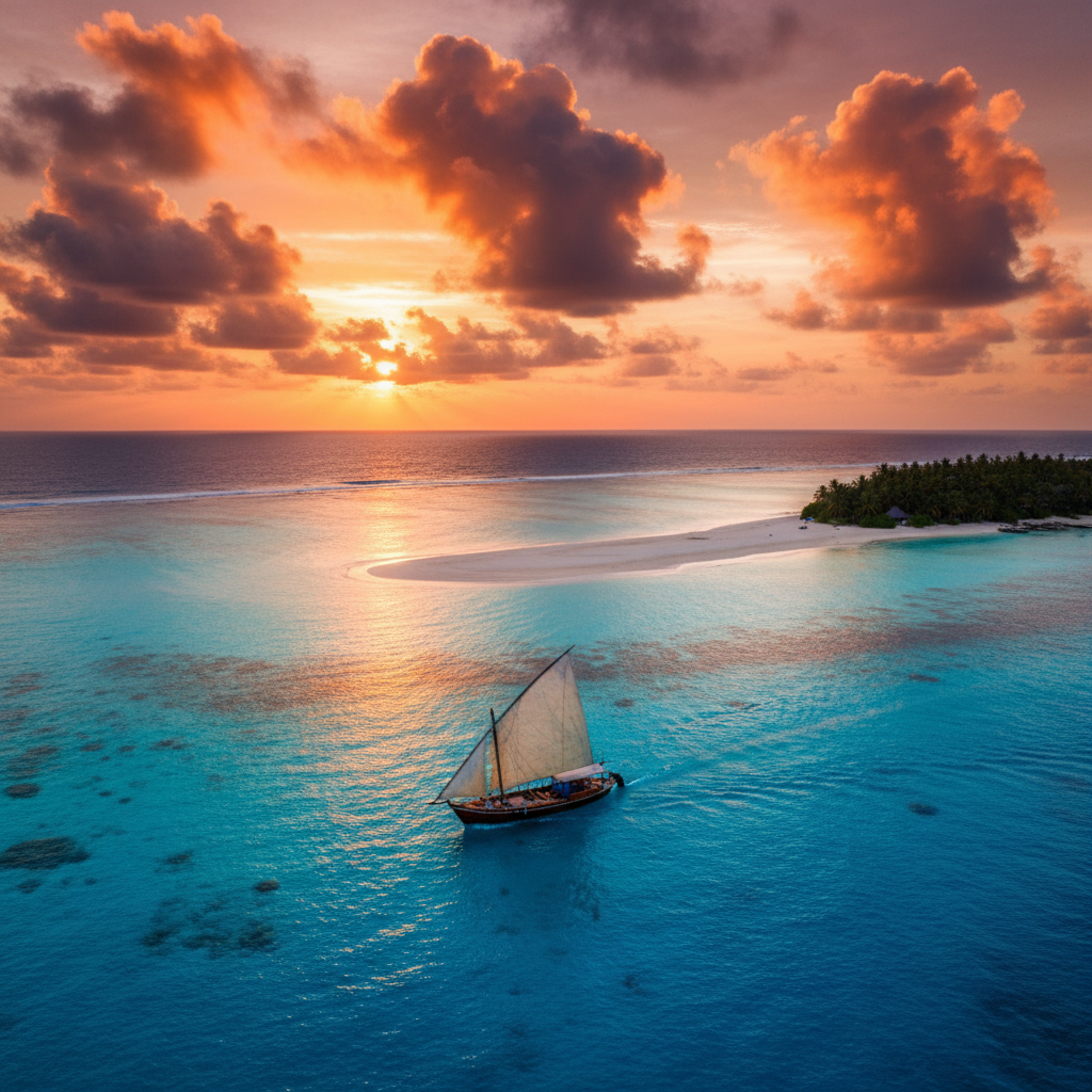 A serene escape to a secluded sandbank, where soft white sands meet endless turquoise waters.